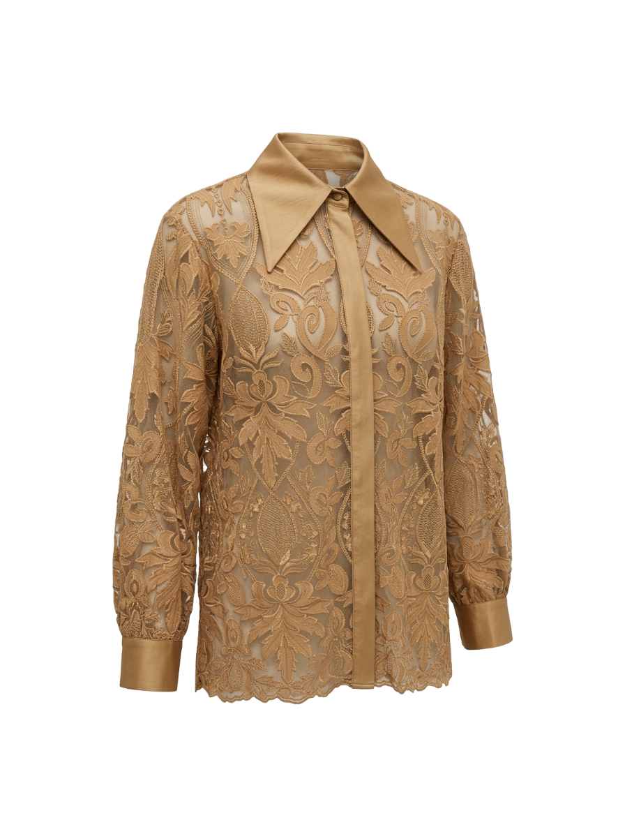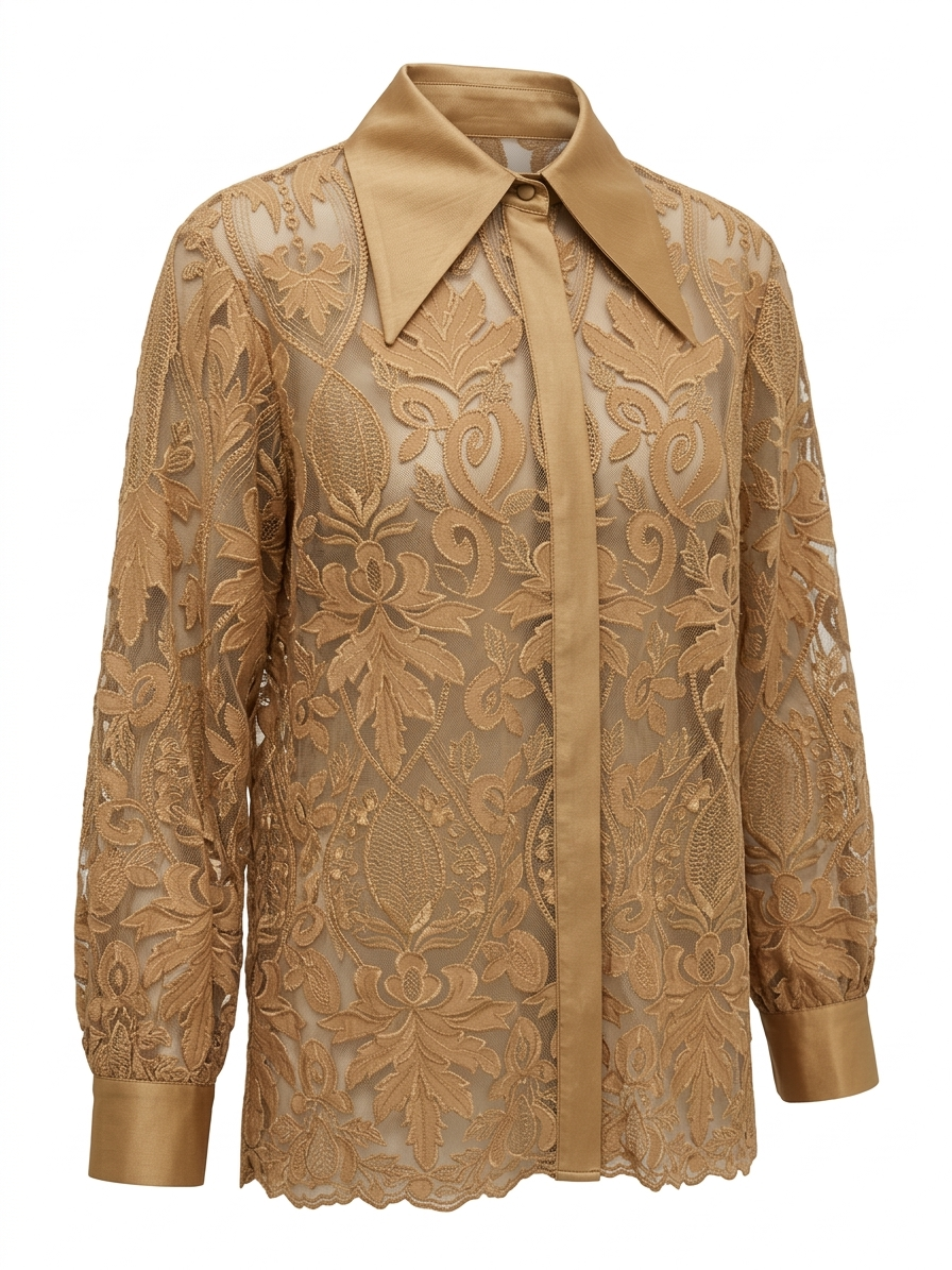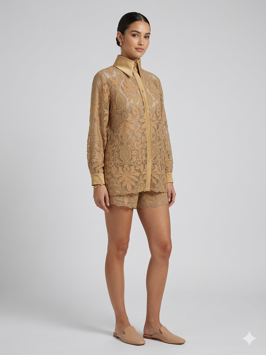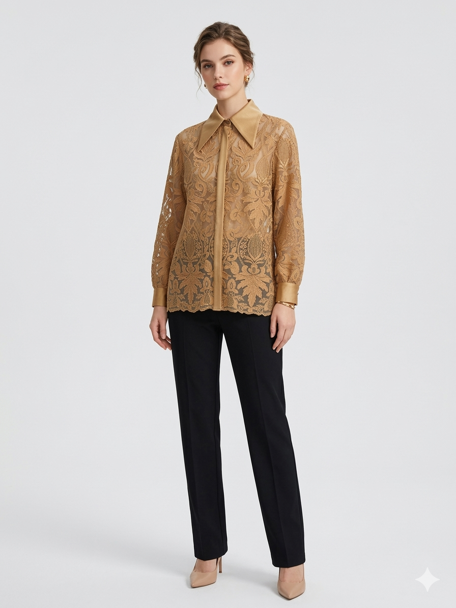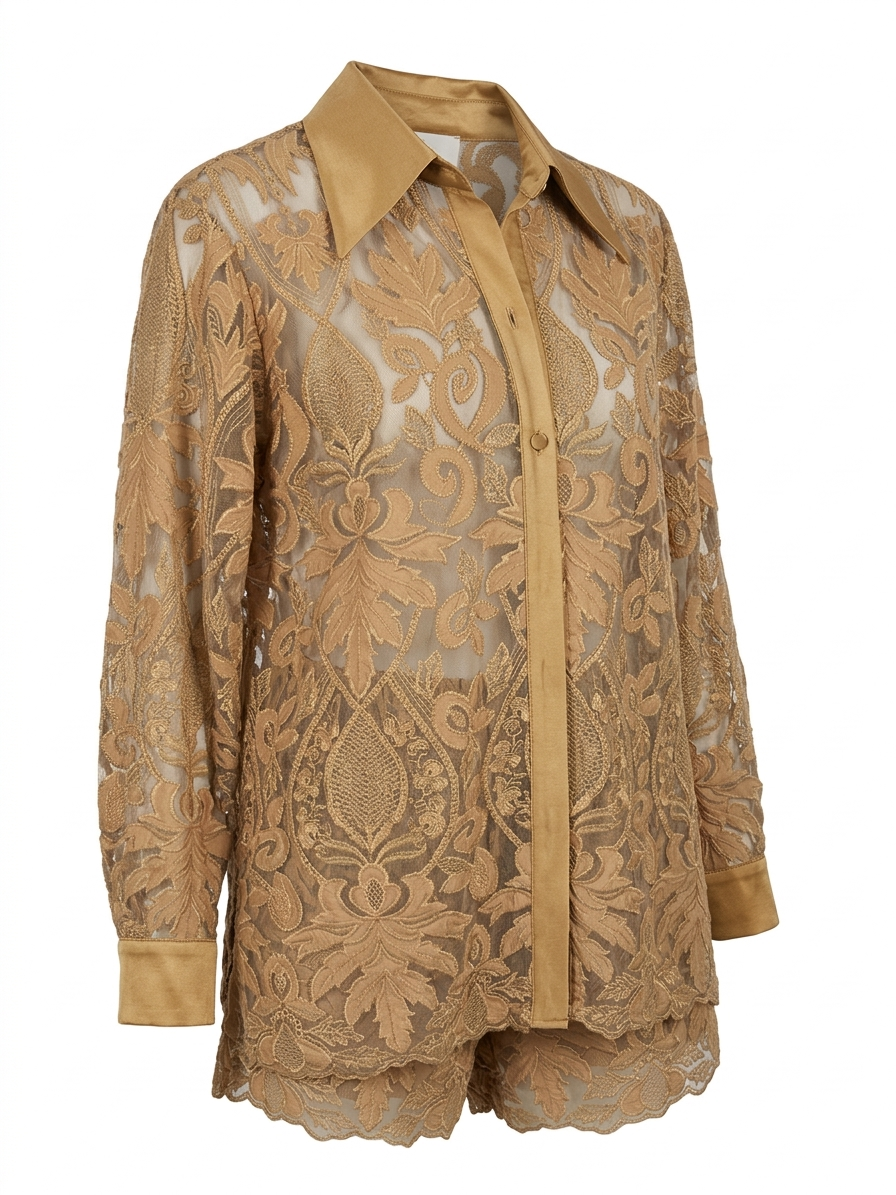 Zmysłowa i niezwykle elegancka koszula marki Babylon, która przyciąga uwagę dopracowanym detalem i luksusowym wykończeniem. Model wykonany z transparentnej, ażurowej koronki o bogatym, roślinnym wzorze nadaje stylizacji lekkości i wyrafinowanego charakteru.